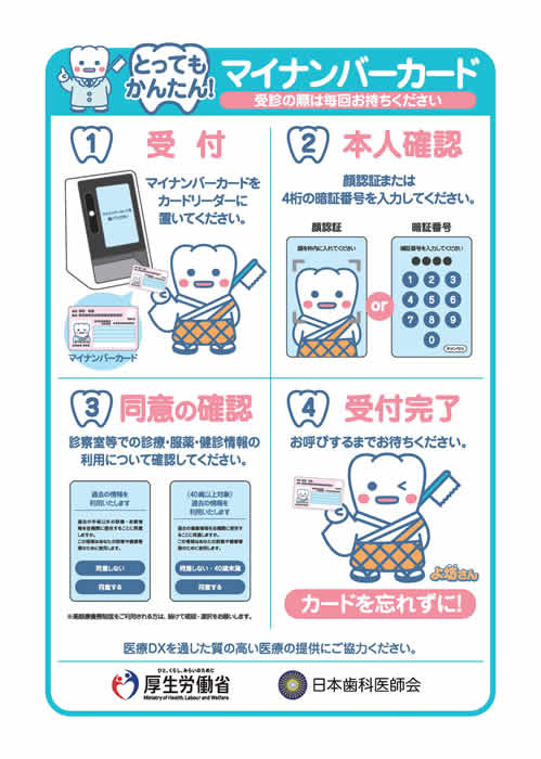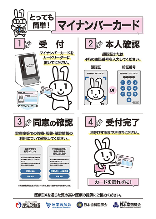保険証の確認の代わりにマイナンバーカードと顔認証による確認が可能です。マイナンバーカードを利用することで、これまで使った薬の情報等を共有して診療に活用し、より質の高い医療の提供に努めています。