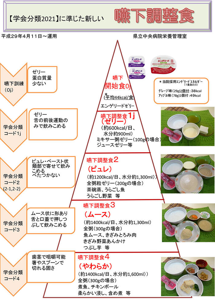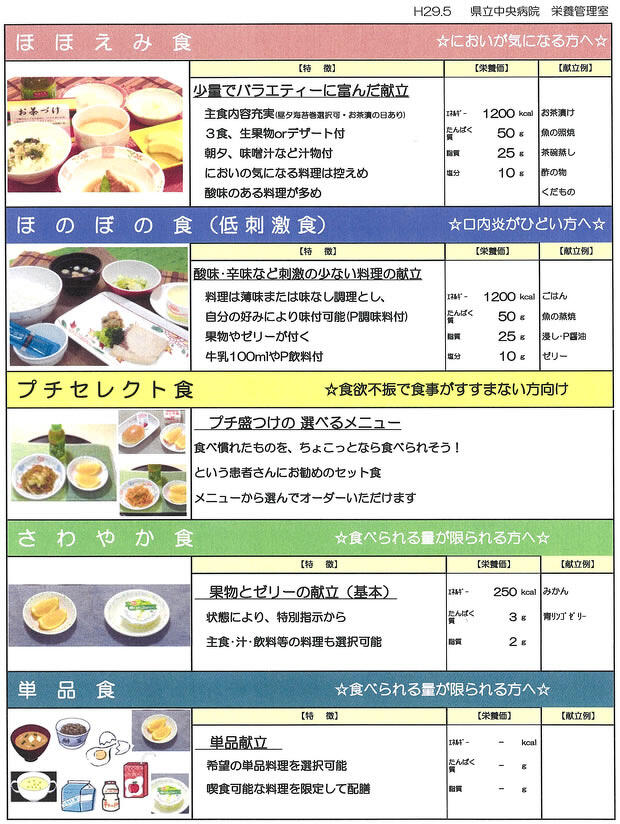 | 一般食 | 成人常食、成人常ハーフ食、軟菜食、軟菜ハーフ食妊婦食、学童食、幼児食、離乳食、ミルク5分粥食、3分粥食、重湯食食欲不振対応食(ほほえみ食・低刺激ほのぼの食・プチセレクト食・さわやか食)、くし食摂食・嚥下障害対応食(嚥下調整食1j(ゼリー食)、嚥下調整食2(ピュレ食)、嚥下調整食3(ムース食)、嚥下調整食4(やわらか食)流動食 | ||