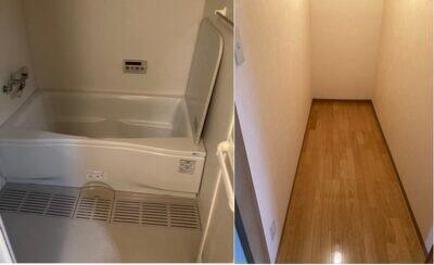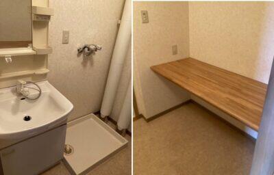 脱衣所には洗濯機置き場の他に、家事台という名の物置きスペースがあります。お風呂も足を伸ばしてゆったりと浸かることができ、追い焚き機能もついています。