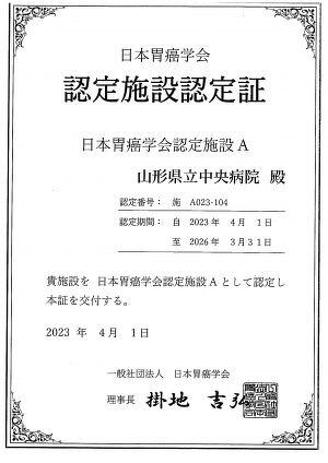 当院は関連学会の専門医数や手術・内視鏡、抗がん剤治療の症例数、学会での論文発表などの施設基準をクリアして、2023年4月より日本胃癌学会認定施設(A)に認定されました。