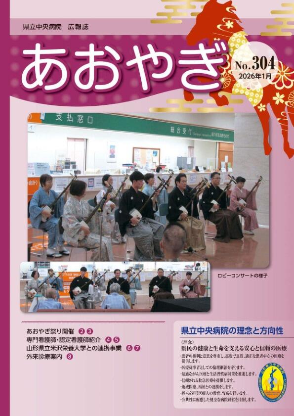 当院の発行する「あおやぎ」は、山形県をはじめ、医療に関心をお持ちの皆さまに、健康についての正しい知識や、その他の医療に関する情報を配信するための広報誌です。