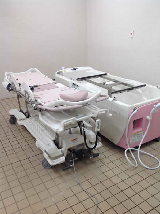 1人で座ったり、立ったりするのが困難な患者さんのために、寝たままや椅子に座ったままでも入浴できる浴槽が整備されています。