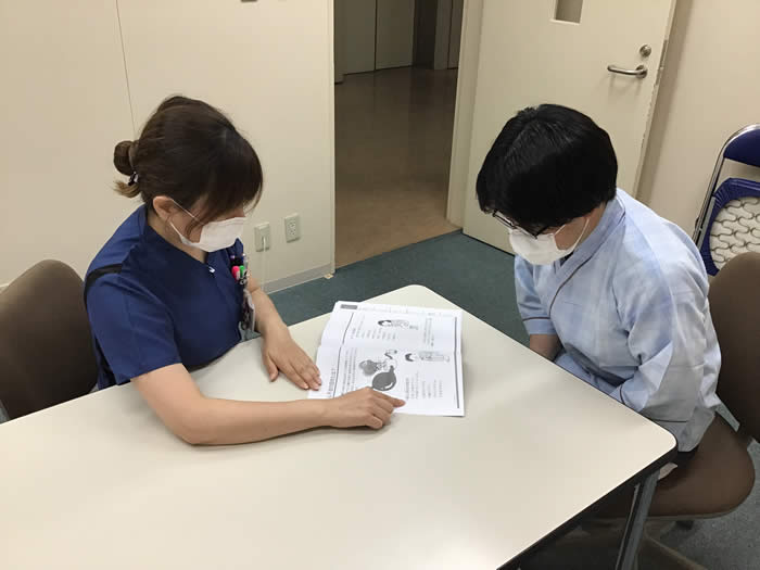 妊娠36週を迎えた妊婦さんに、お産の準備などについて病棟助産師が産婦人科外来に伺って、マンツーマンでお話しています。