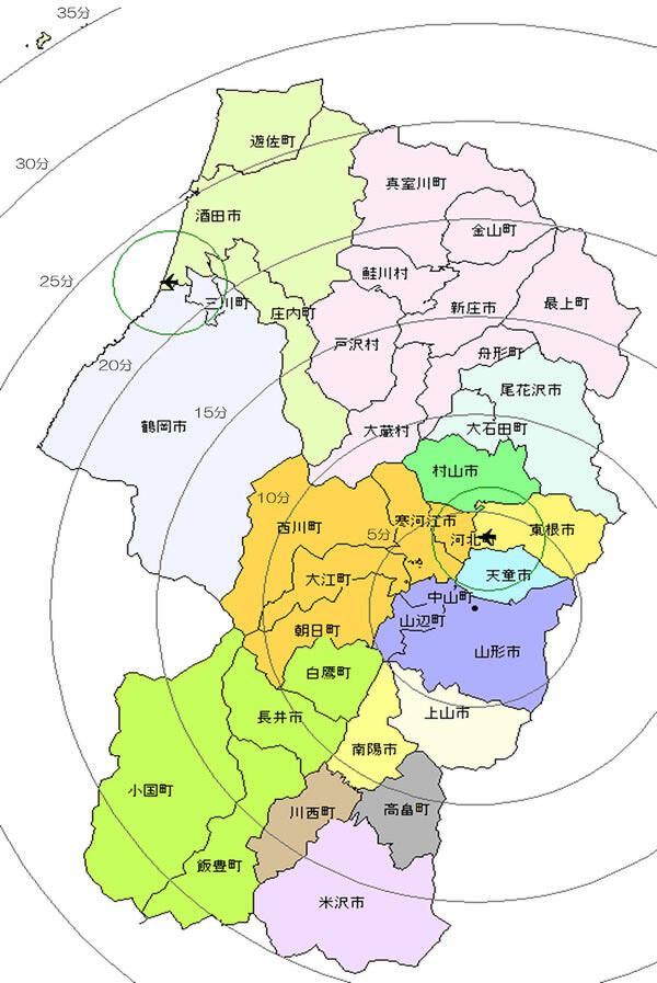 山形県立中央病院(基地病院)からのドクターヘリ飛行範囲円