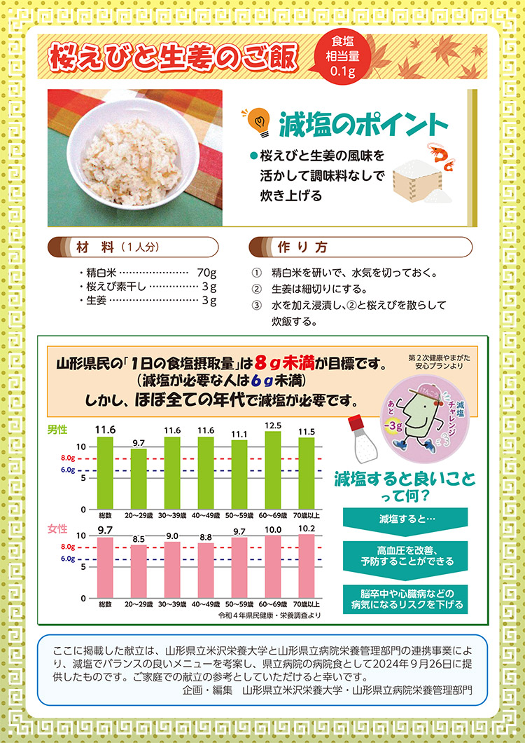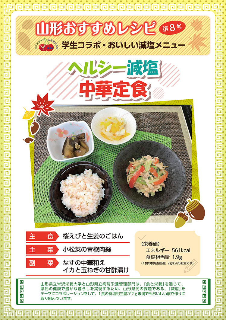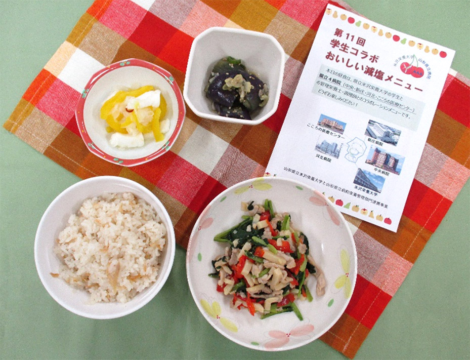 山形県立米沢栄養大学と山形県立病院栄養管理部門は、連携して管理栄養士の人材育成・資質向上に取り組んでいます。県立4病院で、平成27年度より、「学生考案“バランス・減塩・地産地消メニュー”」(平成27年度~平成29年度)・「“学生コラボ”・おいしい減塩メニュー」(平成30年度〜令和5年)を提供しています。