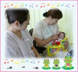 ・音楽療法士が、赤ちゃんを優しくなでながら子守歌や童謡をハミングで歌います。