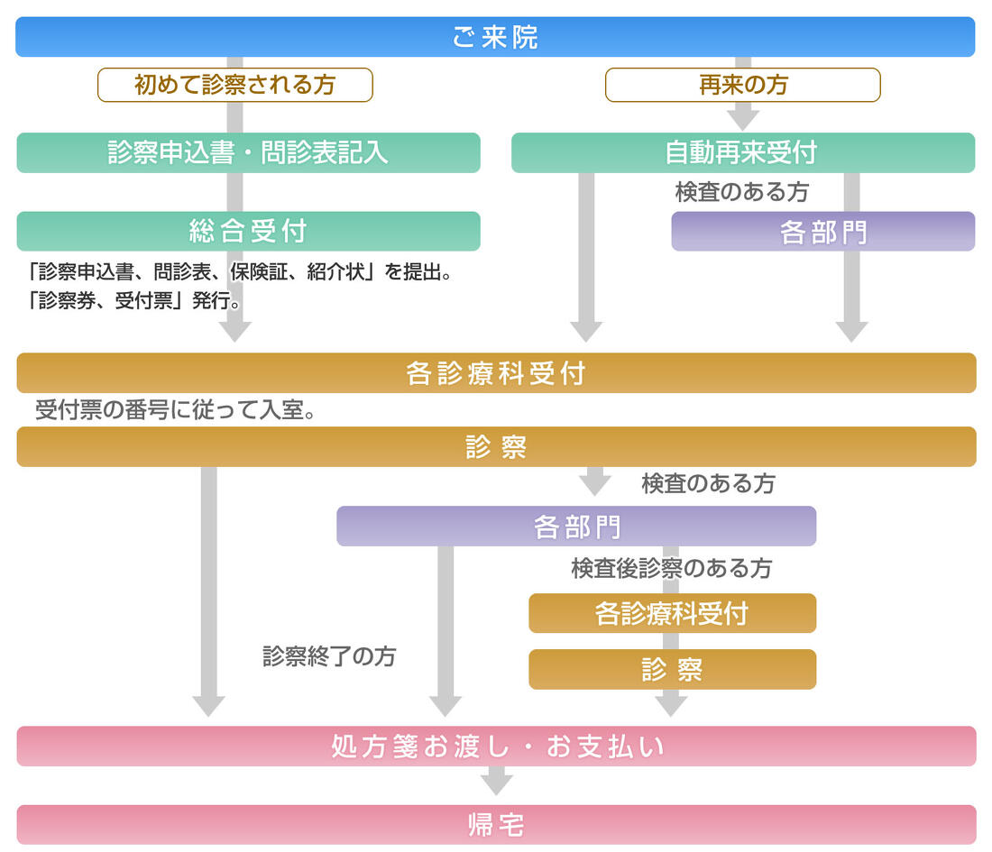 そのために、当病院ではかかりつけの先生からの紹介状をお持ちの患者さんを、できるだけ早く診察するよう努めておりますが、重とくな患者さんや緊急の患者さんを優先しなければならないことがあり、時には待ち時間が長くなることがあります。