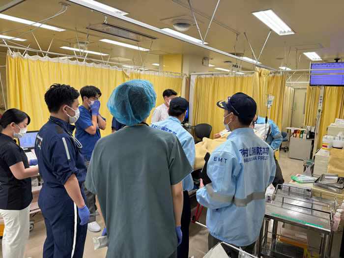 救急科の主な業務は救急患者様への緊急蘇生を含む初期診療、重症患者様の集中治療管理、ドクターヘリでの病院前救急診療を3本柱に、初期研修医への指導や救急救命士の病院実習指導、メディカルコントロール体制におけるオンライン指示などを行っております。救急室担当と集中治療室担当に分かれて勤務しており、それぞれ休日も日勤者を配置し、毎日当科の医師が診療を行う体制を整えています。救急医療に休みはありません。県民の皆様に安心して暮らしていただけるように、3次救急医療機関としての役割を果たすべく、「断らない救急」をモットーに日々精進しております。
