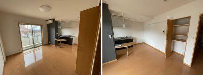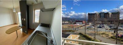 大容量の靴箱、16帖ほどある広いリビングダイニング、キッチンはプロパンガスで、私は二口の置き型コンロを置いて使っています。一人暮らしにはあまりにも、十分すぎるお部屋です。ちなみに冬は、窓が多くて少し寒いのでこたつがあると便利です。
