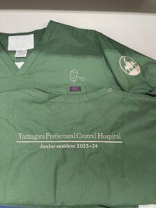 ところで、少し前に同期でお揃いのスクラブを作成しました!山形と言ったら『緑』かなと勝手な偏見で、色はモスグリーンにしました。(笑)左肩には県中の病院マークを、背中には病院名と年度を入れました。そして、胸元には山形県が誇る名物ゆるキャラ「きてけろくん」を入れました!!それぞれ好みがあって意見も別れましたが、同期でお揃いのスクラブを作れて良かったです。